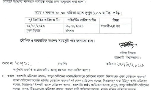 Note: All Examinees of Final Professional Examination November/2025 are requested to check the rescheduled exam dates for Surgery – 2nd Part. The rescheduled dates of the respective subject for Final Professional Examination November/2025 will be held from 09 to 19 April 2026....